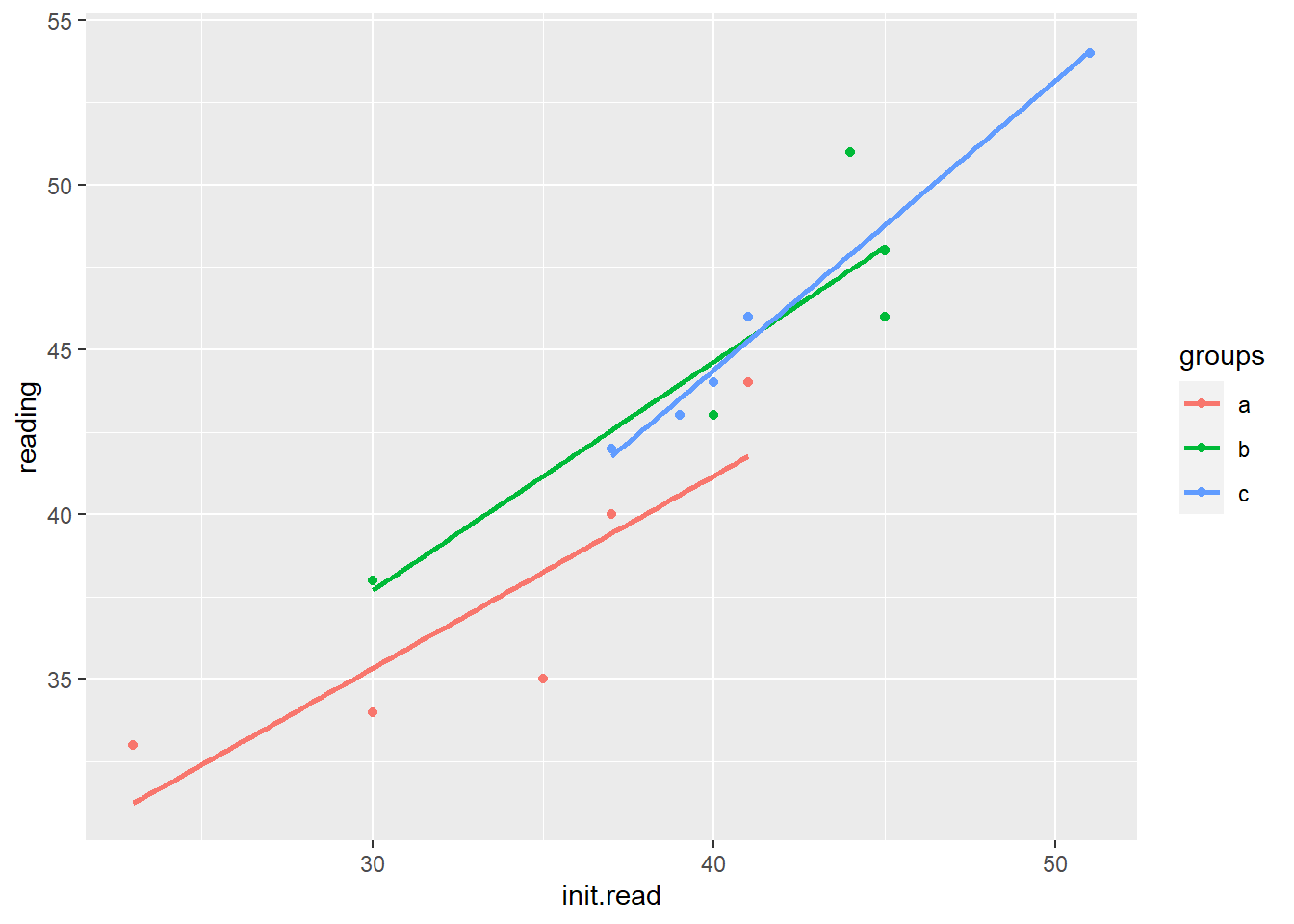 ggplot(data=dat, aes(x=init.read, y=reading, group=groups, color=groups)) +