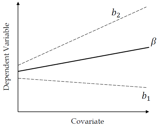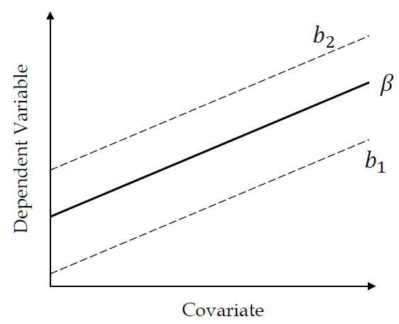 \[y_{ij} = \mu + {\alpha _j} + \beta {z_{ij}} + {\varepsilon _{ij}}\] - \(y_{ij}\) is the ith score of the jth group. - \(\mu\) is the constant common to all y scores - \(\alpha_j\) is teh effect of the jth treatment level (i.e, the group-specific effect) - \(\beta {z_{ij}}\) quantifies the influence of the covariate (z) on the dependent variable (y). Note that the parameter \(\beta\) represents the degree of (linear) relation between the covariate and teh dependent variable. - \(\varepsilon _{ij}\) reflects random variation due to any uncontrolled source.