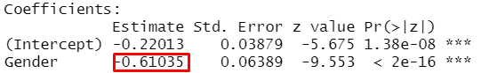 ## Gender -0.61035 0.06389 -9.553 < 2e-16 ***