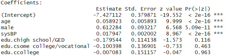 ## glm(formula = TenYearCHD ~ age + male + sysBP + edu.c, family = binomial,